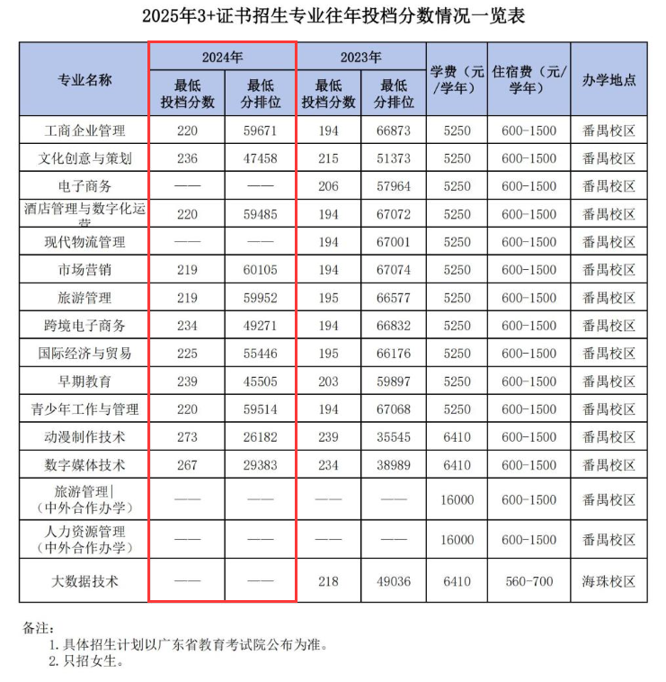 广东女子职业技术学院2024年3+证书招生计划及往年投档分数一览表