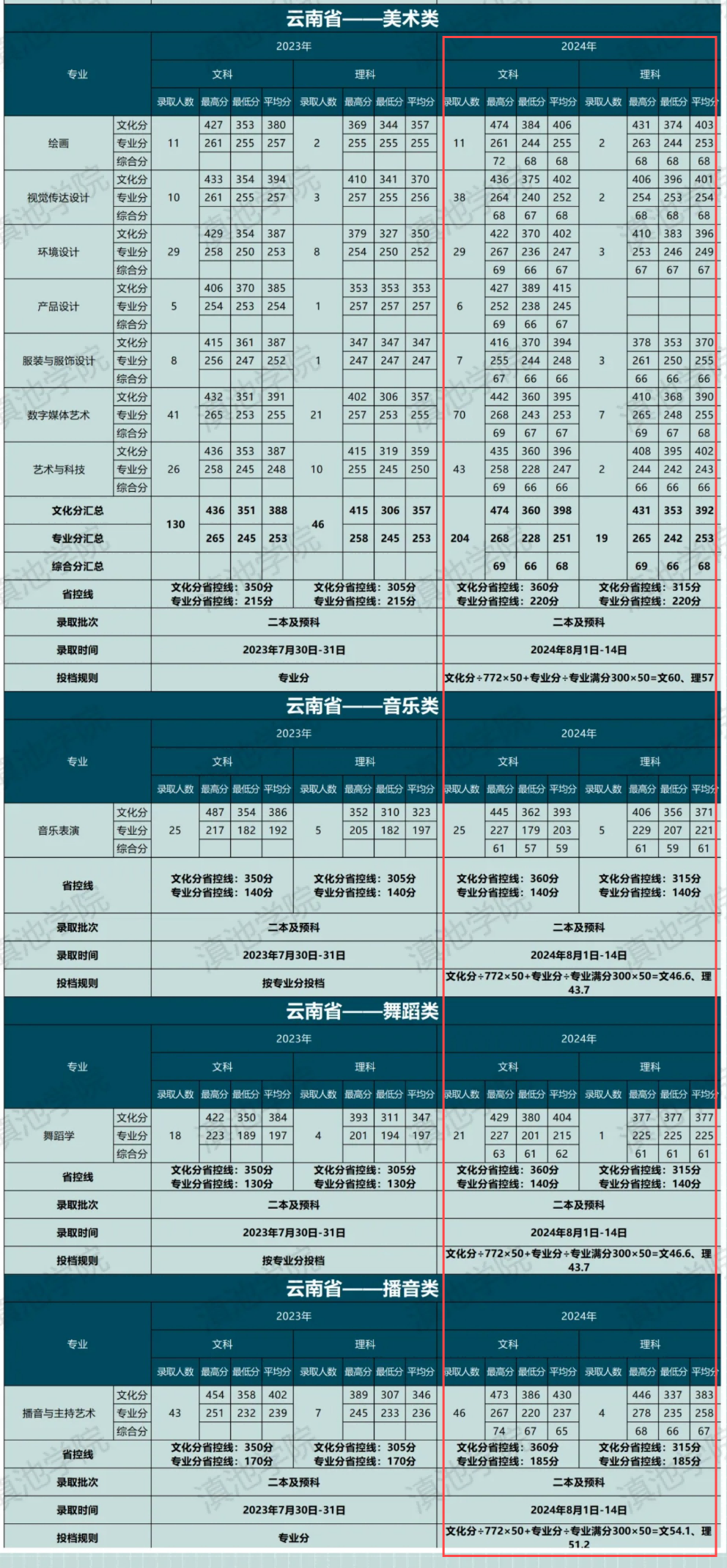 (省外艺术类)滇池学院2024年招生录取情况统计:https://ynudcczs.bysjy.com.cn/module/news_info.html?article_id=20831&